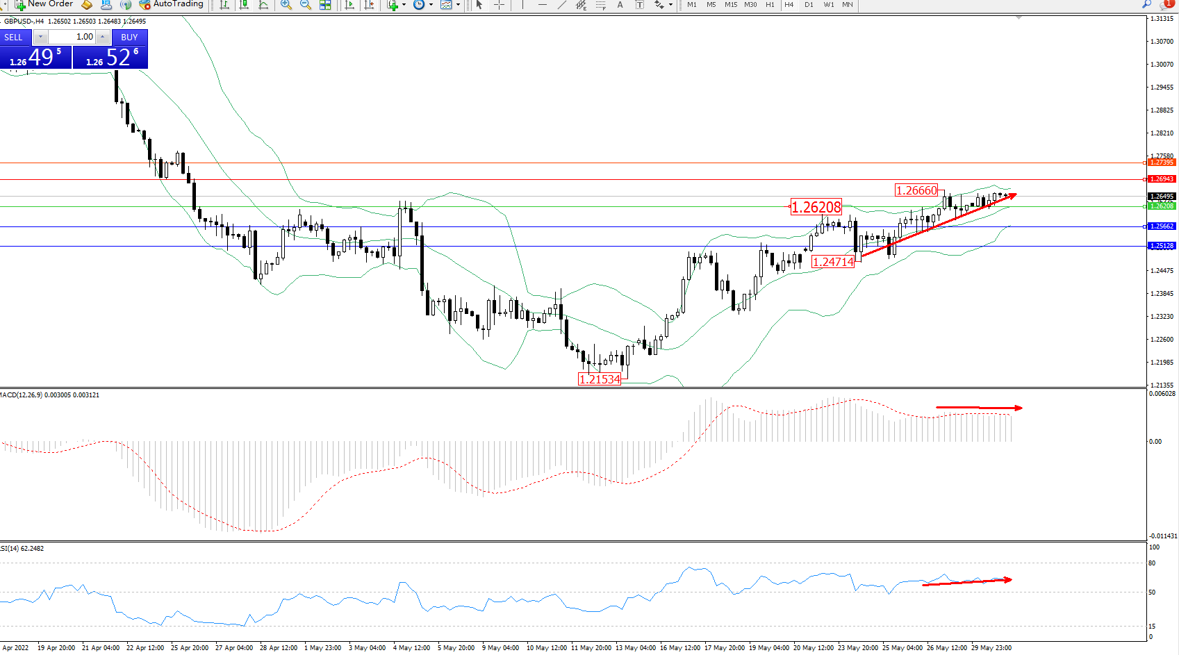 交易策略:1.26208上方看涨,目标1.26943、1.27395
