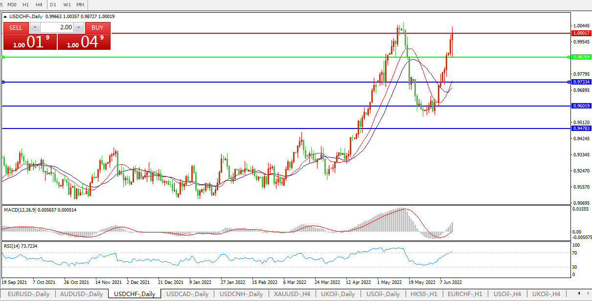 USDCHF  USDCAD 75基点加息甚嚣尘上,美元兑瑞郎持续上攻