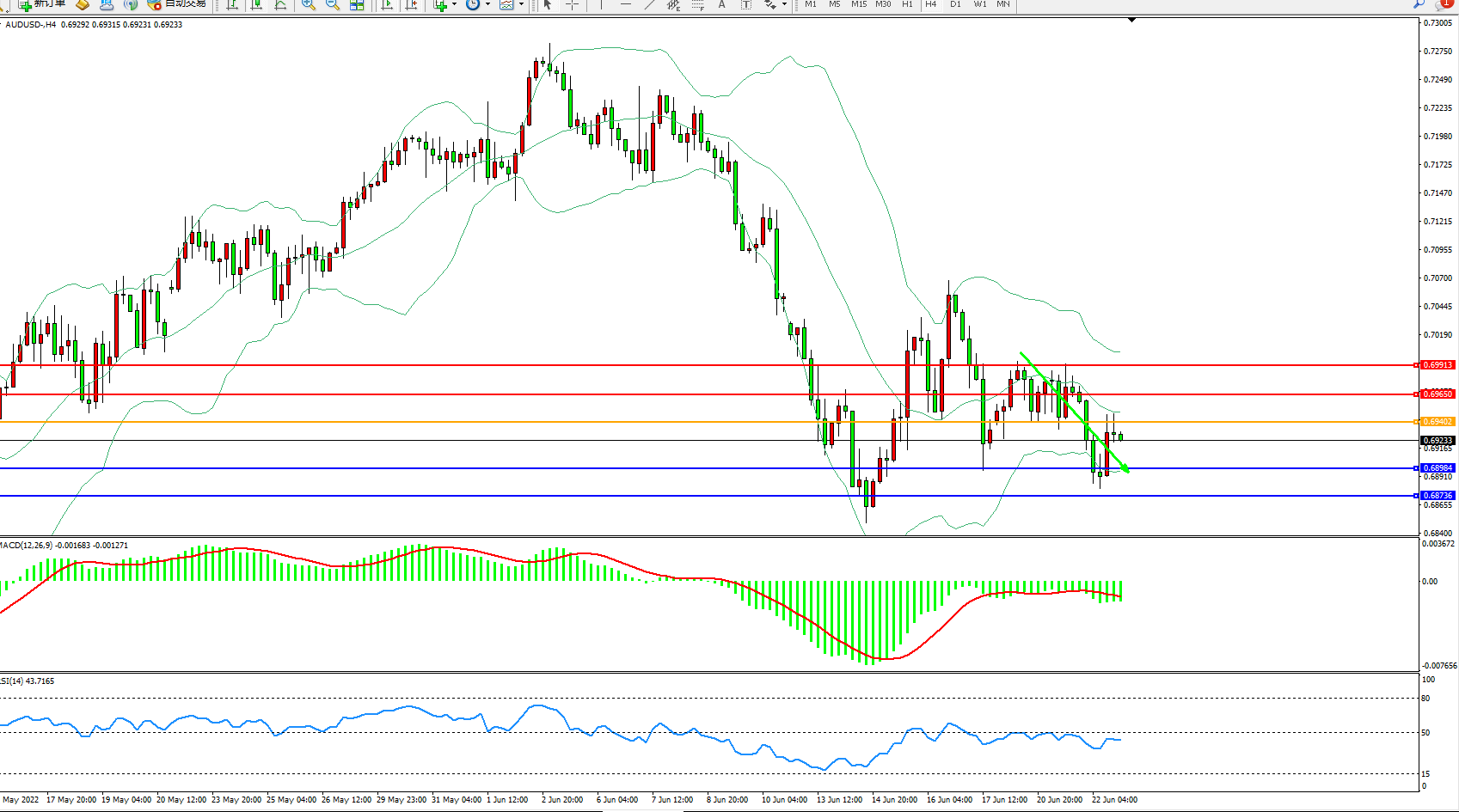 交易策略:0.69402下方看跌,目标0.68984、0.68736