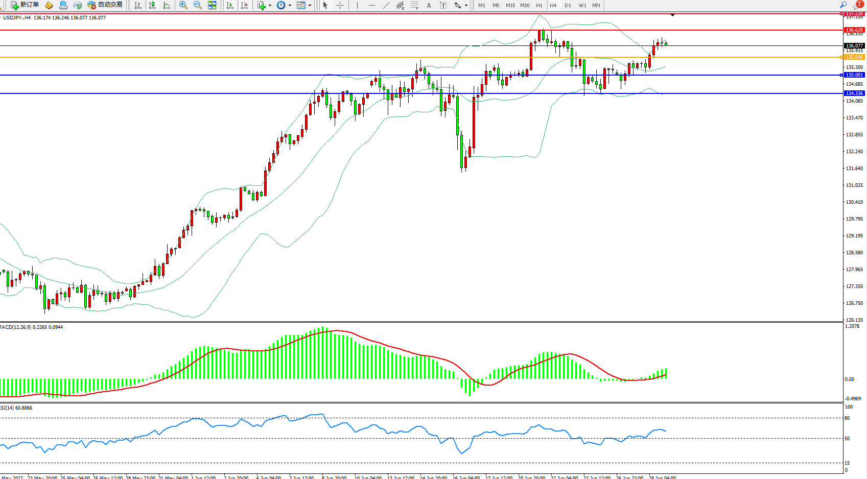 4小时图看:长时间维持在布林带指标通道内宽幅震荡中,延续上轨附近节点不断向上移动,布林带指标呈缓慢张口走势持续,MACD指标处于0轴线上方多头区域维持徘徊,RSI指标处于50均衡线上側整理中;