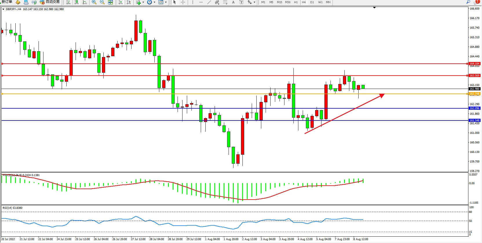 4小时图看:多头动力维持震荡向上移动,短期纠结整理整理,市场看涨情绪笼罩,MACD指标处于0轴线上側徘徊,RSI指标处于50均衡线上側窄幅整理;