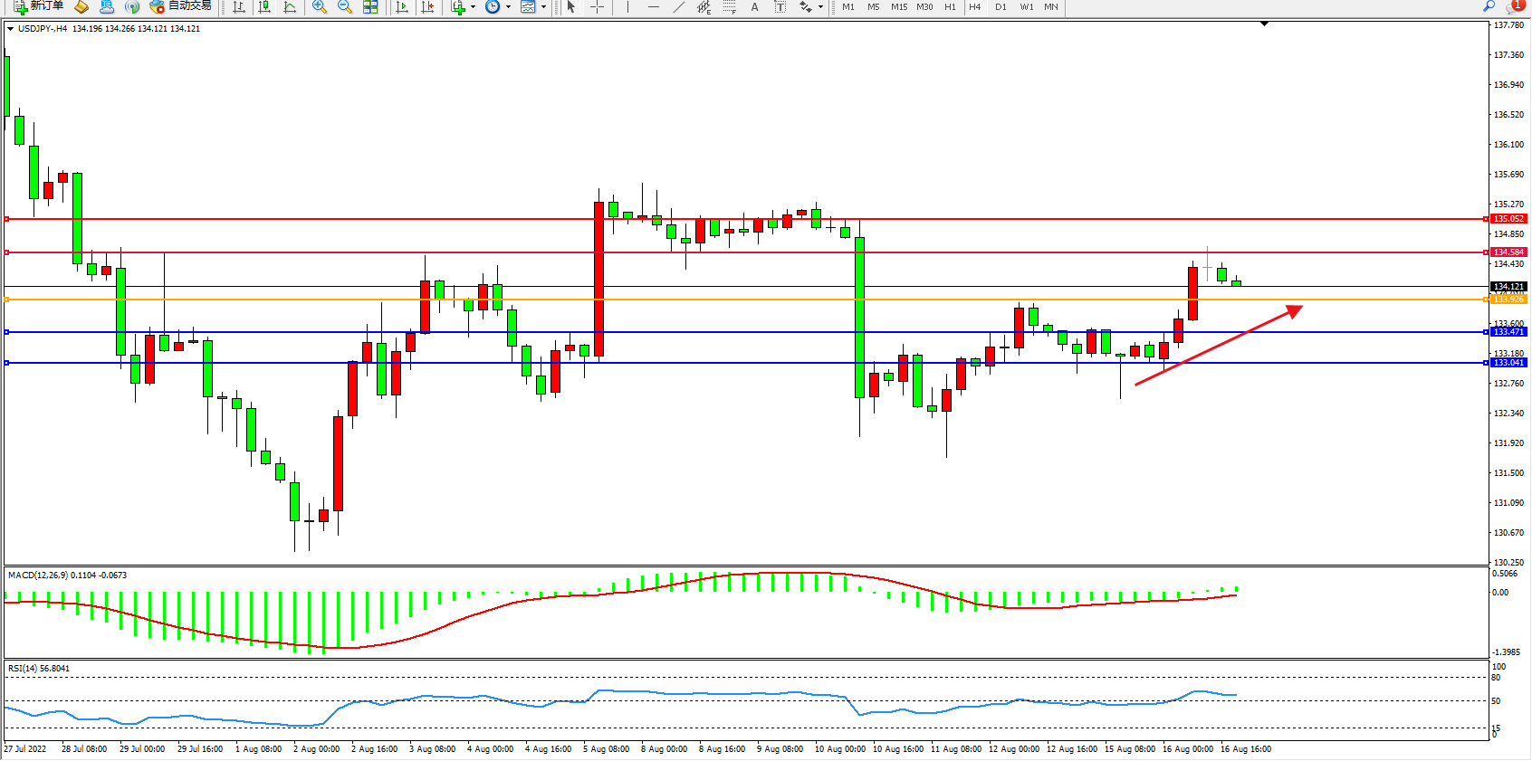 4小时图看:多头动力维持震荡上扬态势良好,短期有继续向上移动态势,MACD指标处于0轴线上側徘徊,RSI指标处于50均衡线上側窄幅整理;
