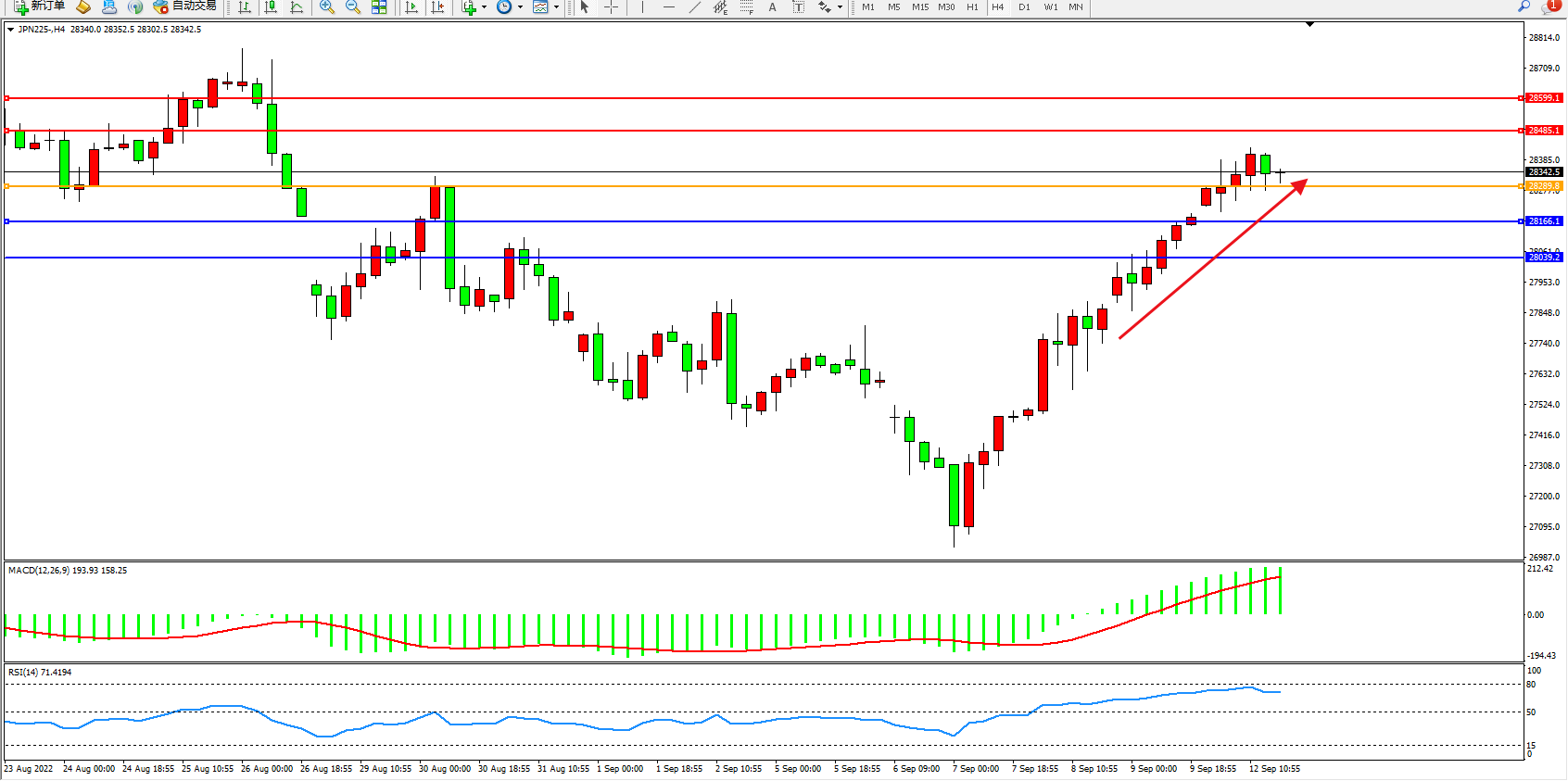 日经指数JPN225——4小时K线图显示: