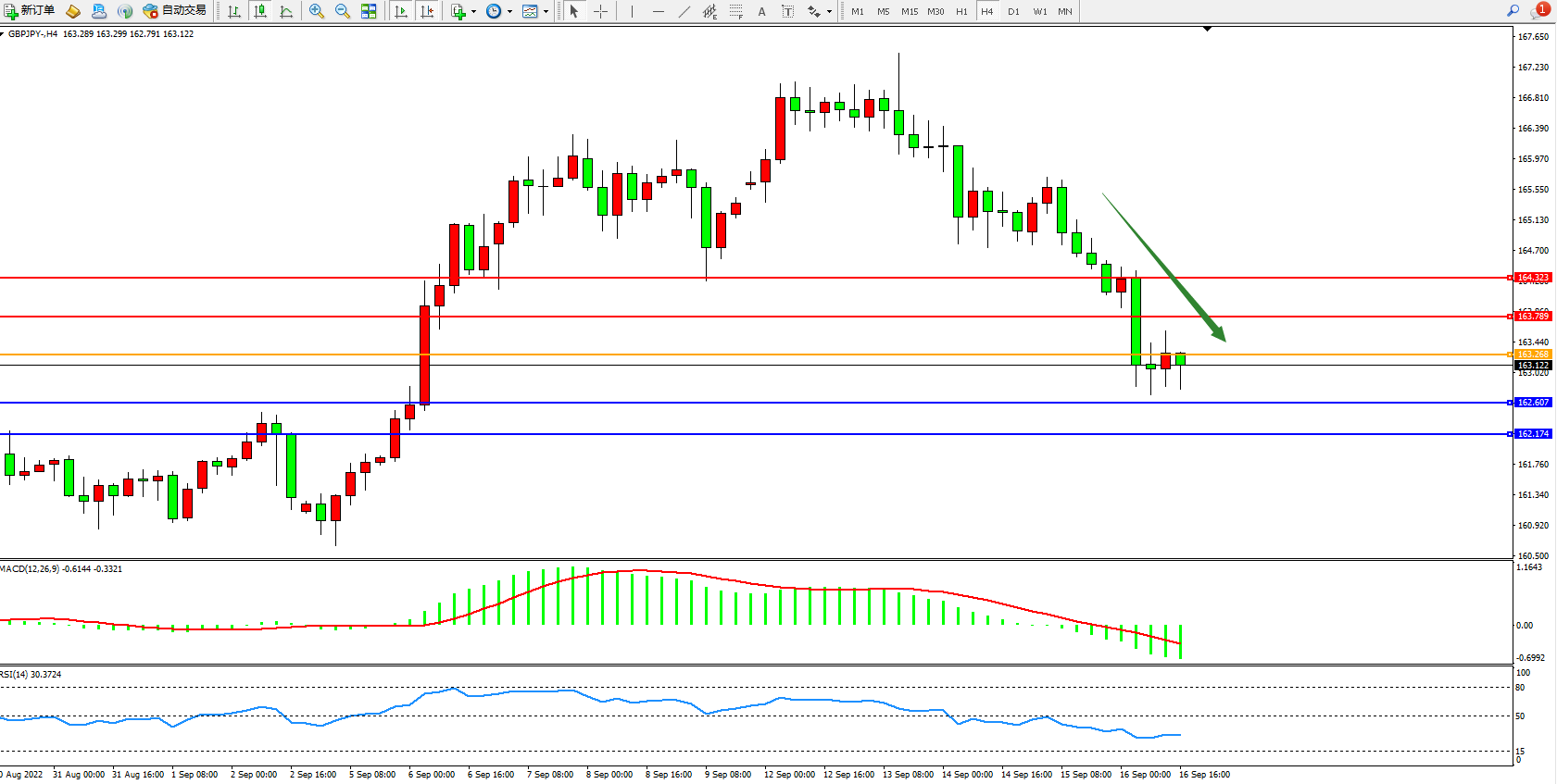 交易策略:163.268下方看跌,目标162.607、162.174
