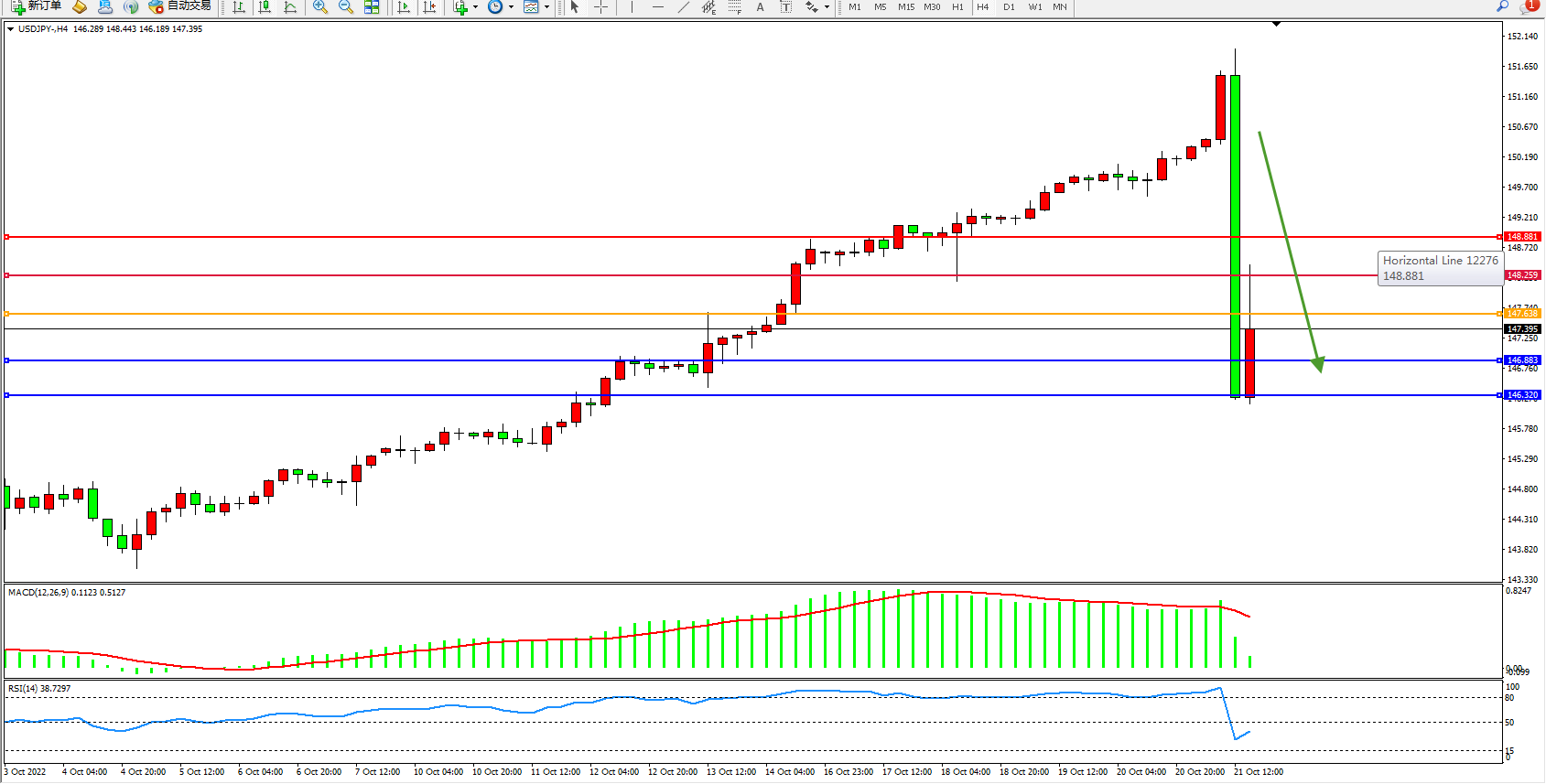 美元日圆USDJPY——4小时K线图显示: