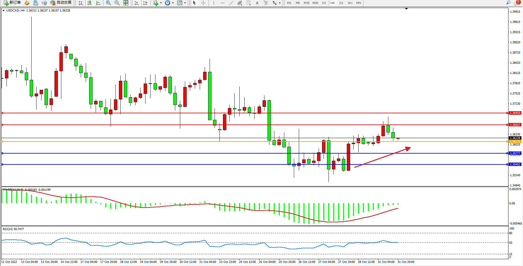 美元加元USDCAD——4小时K线图显示: