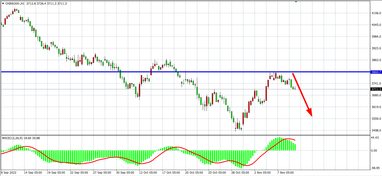 1小时图看,沪深300维持在3800之下运行,趋势偏向弱势,同时MACD量能在零轴之上小幅萎缩,显示行情短期内或进一步走弱。日内在3800之下看跌为主,下方目标3650-3580