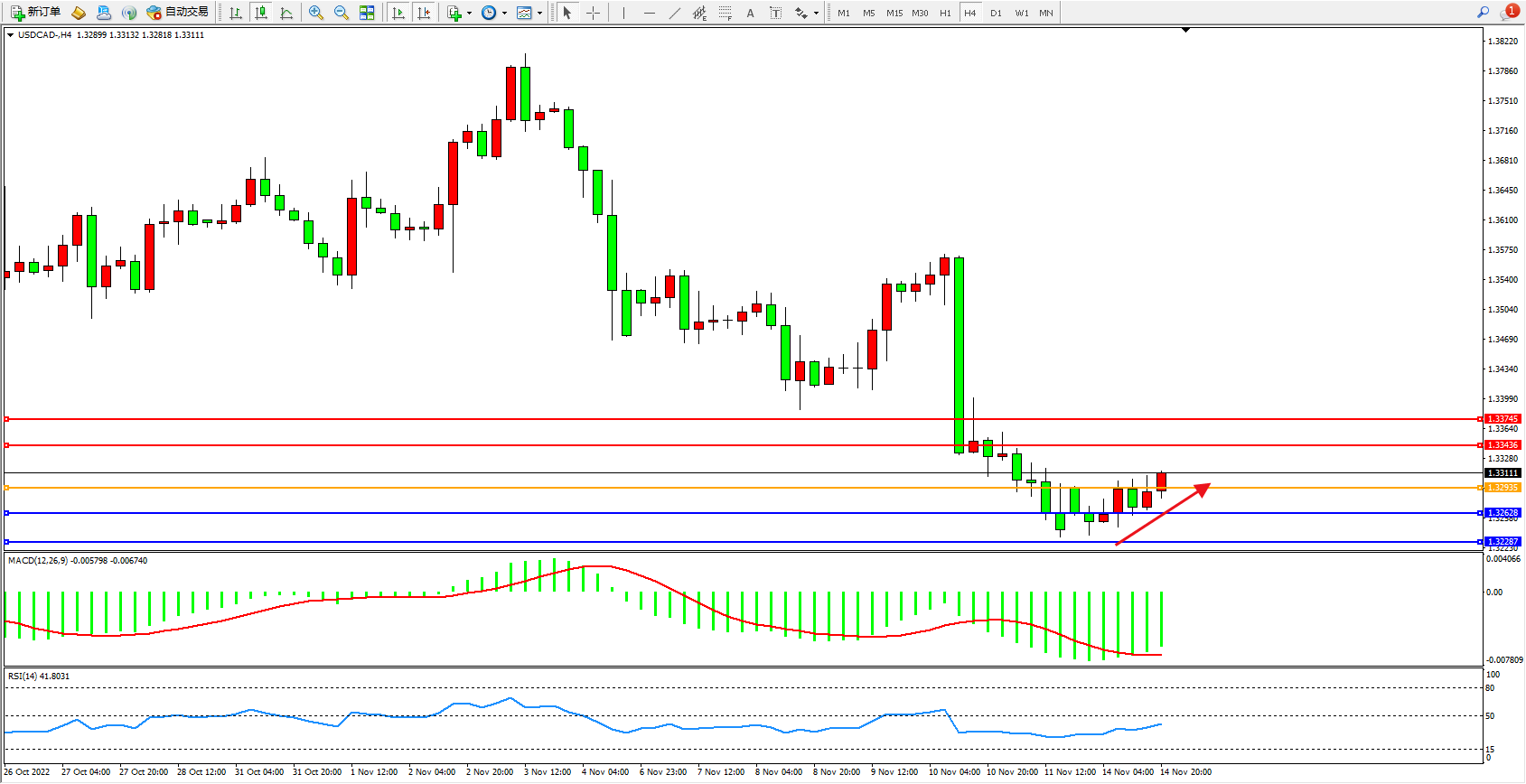 美元加元USDCAD——4小时K线图显示: