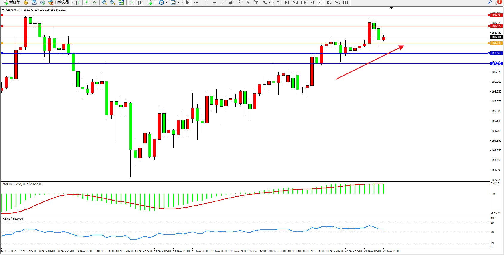 4小时图看:多头上行趋势态势良好,短期看涨情绪有持续向上移动态势,MACD指标处于多头区域高位整理,RSI指标处于50均衡线上側整理;