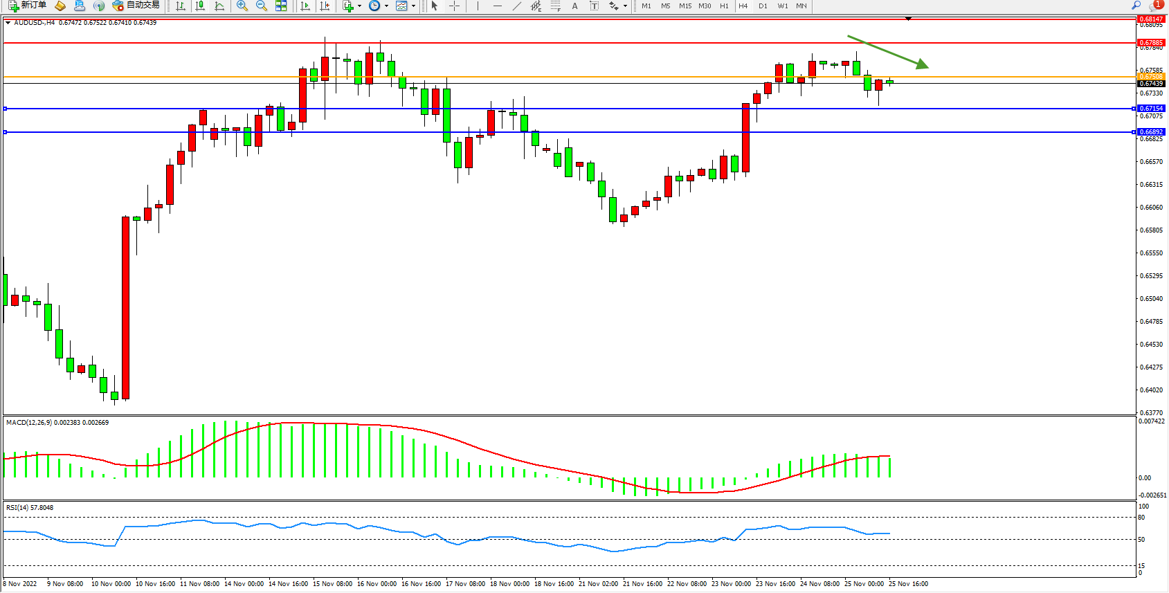 备选策略:0.67508上方看涨,目标0.67885、0.68147