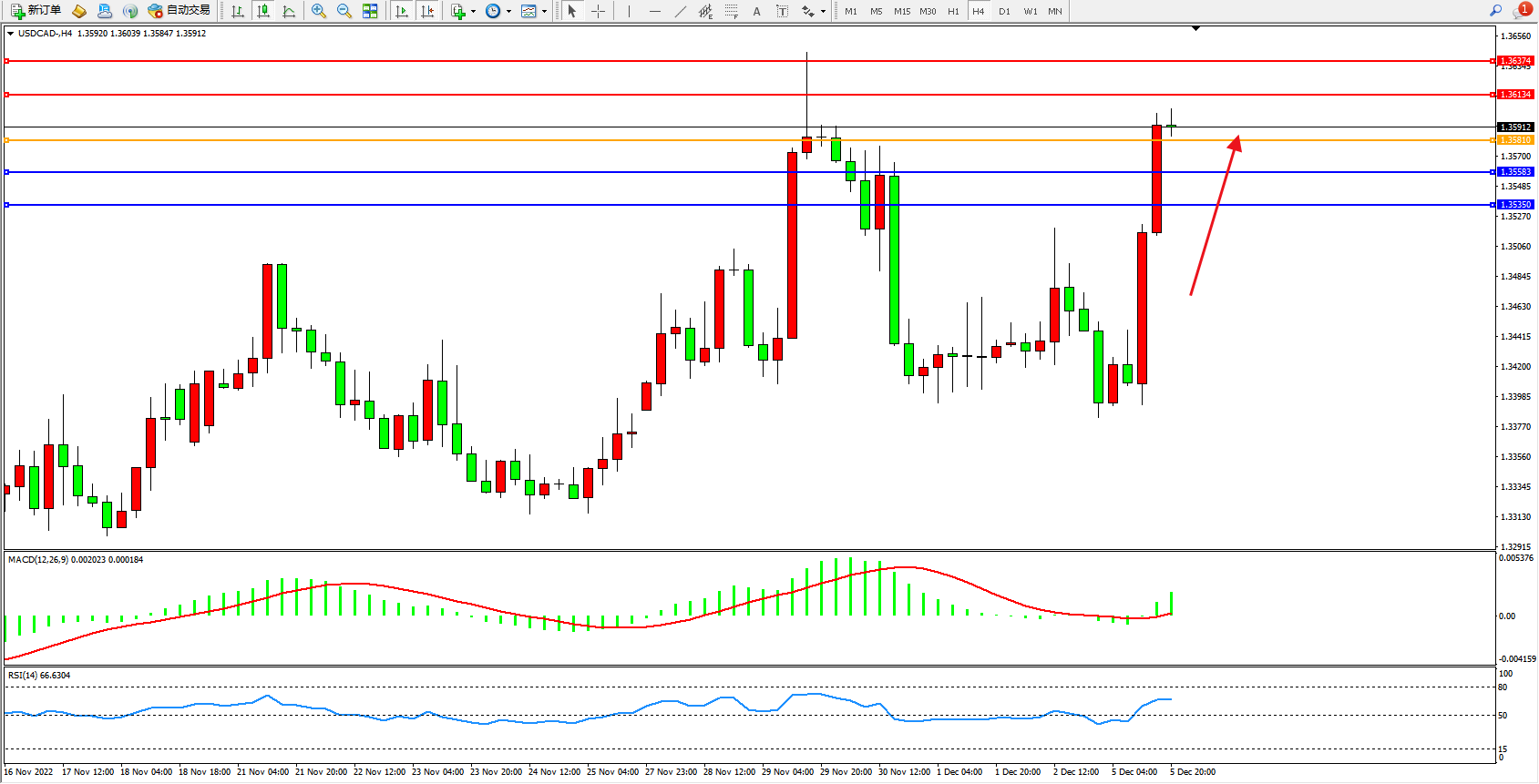 美元加元USDCAD——4小时K线图显示: