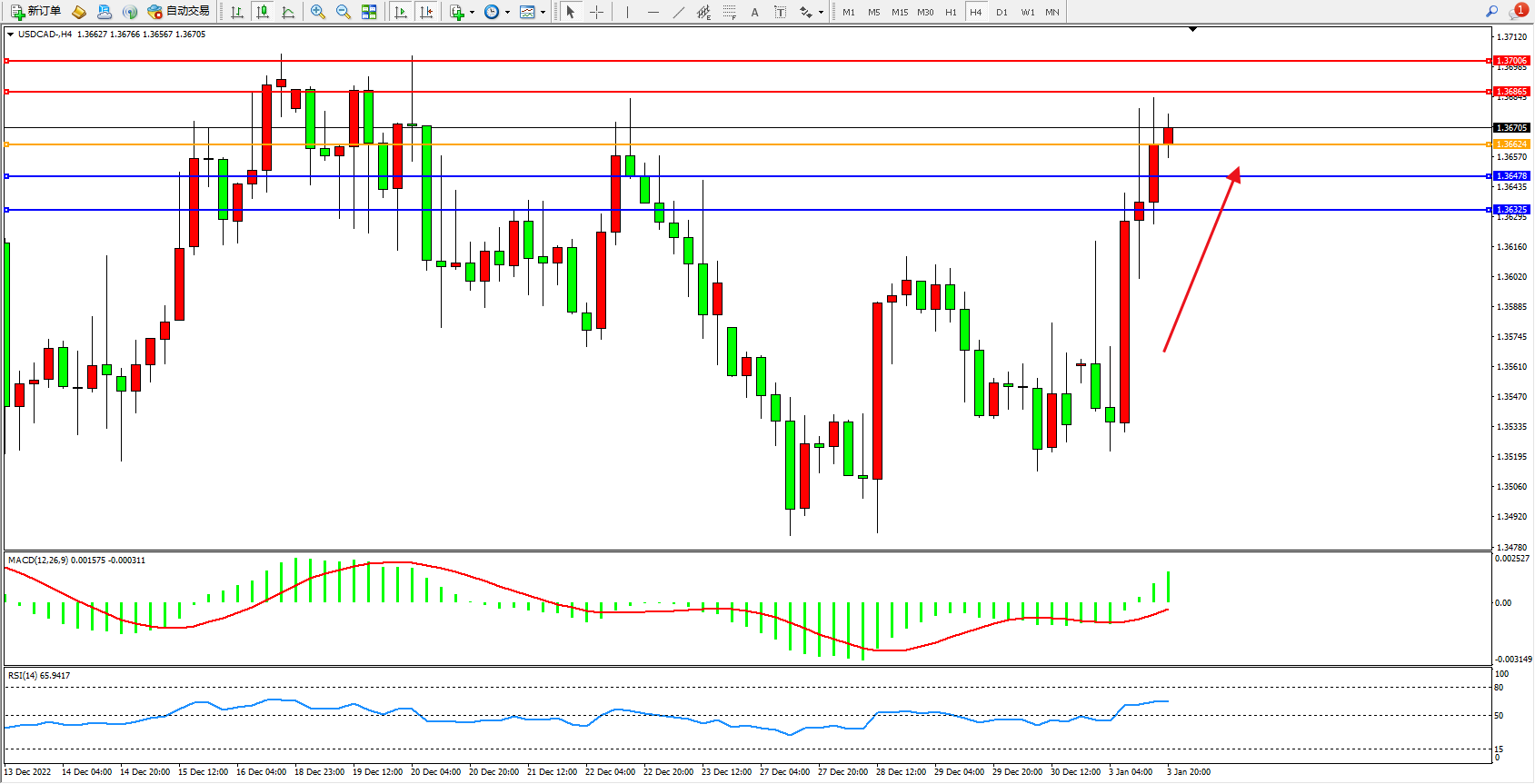 美元加元USDCAD——4小时K线图显示: