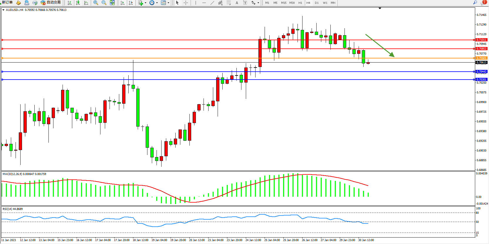 交易策略:0.70685下方看跌,目标0.72443、0.70301