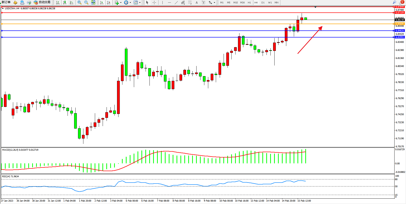 美元人民币USDCNH——4小时K线图显示: