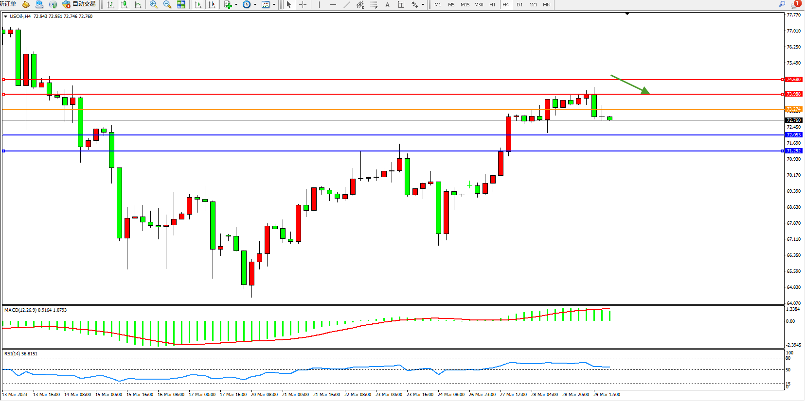 交易策略:73.274下方看跌,目标72.053 71.292
