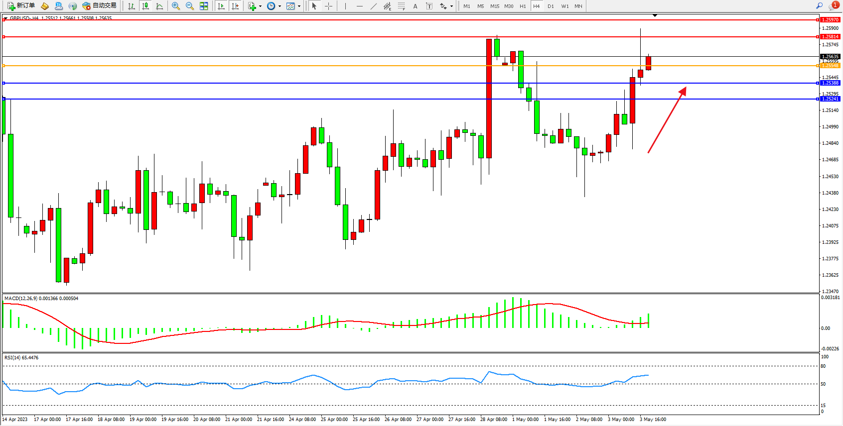 交易策略:1.25548上方看涨,目标1.25814  1.25970