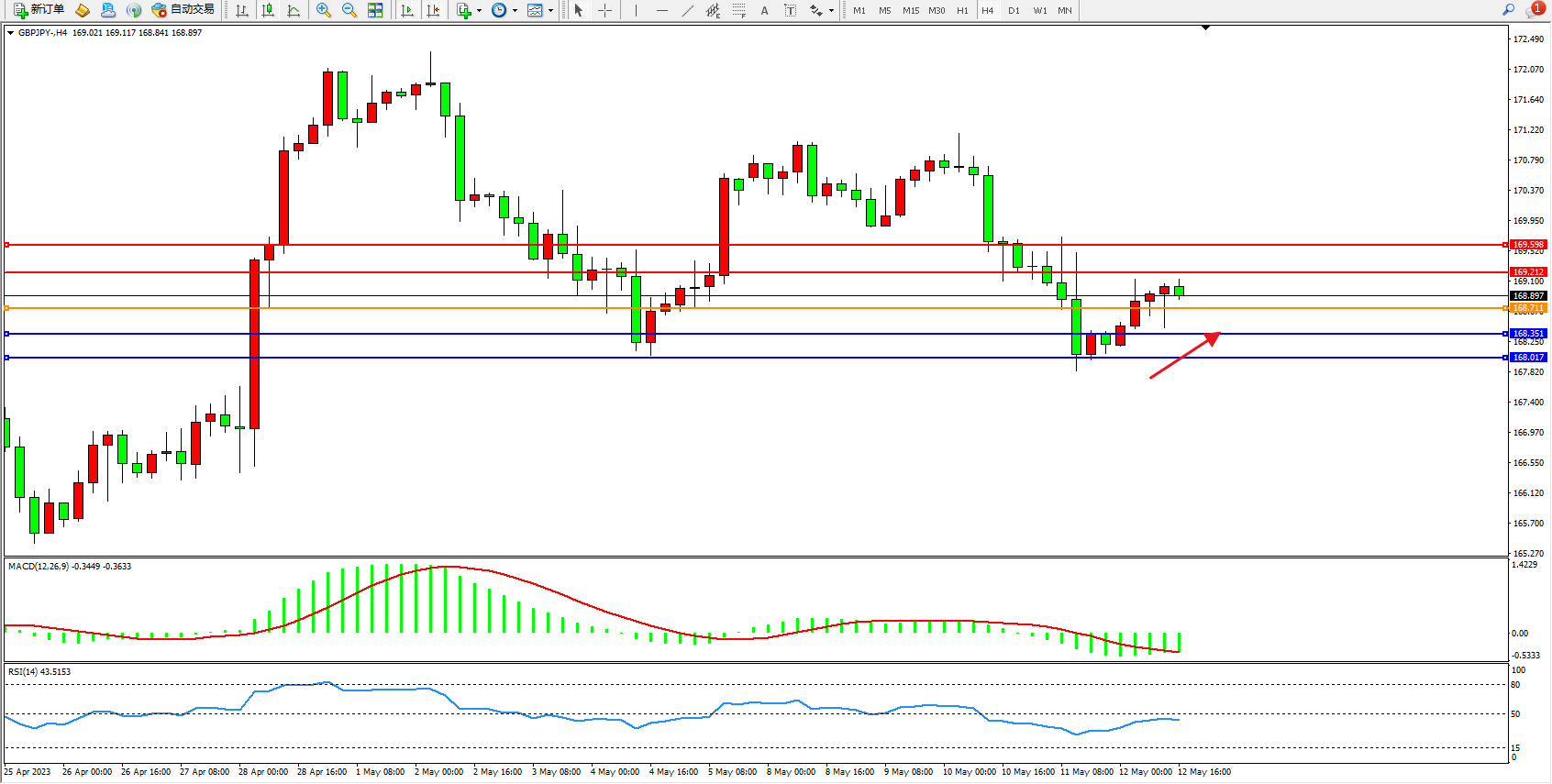 备选策略:168.711下方看跌,目标168.351  168.017