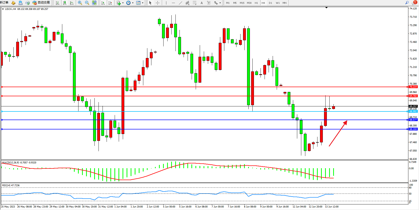 原油USOil——4小时K线图显示: