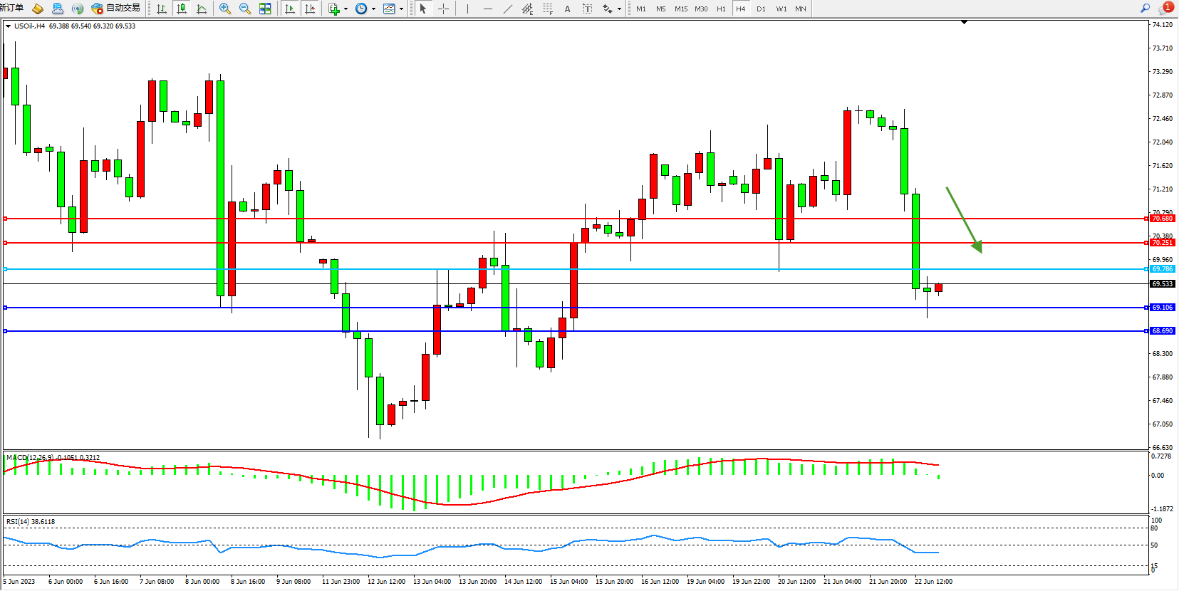 原油维持69.533附近震荡,美国至6月16日当周EIA原油库存 -383.1万桶,预期32.9万桶,前值791.9万桶。EIA俄克拉荷马州库欣原油库存 -9.8万桶,前值155.4万桶。
