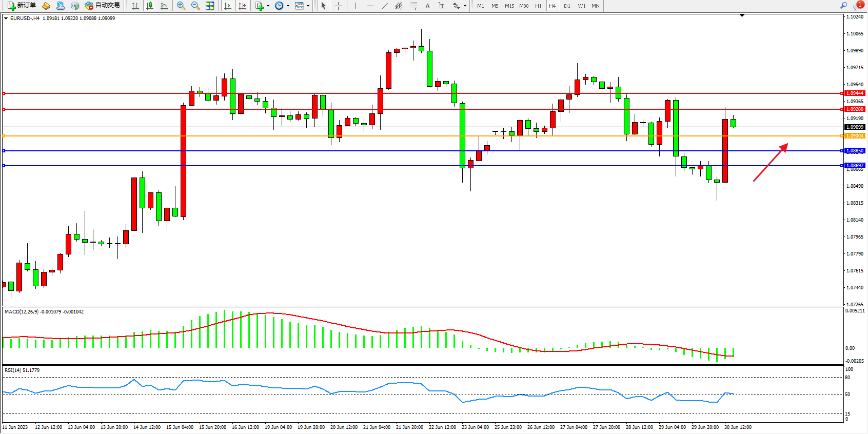 欧元美元EURUSD—4小时K线图显示: