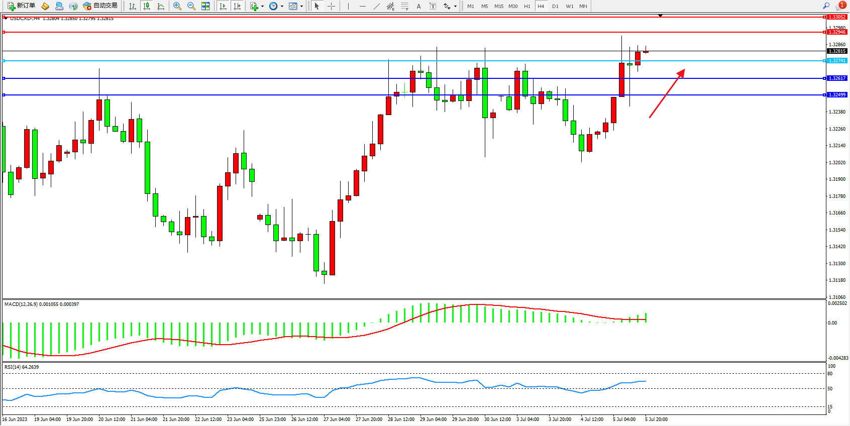 美元加元USDCAD——4小时K线图显示: