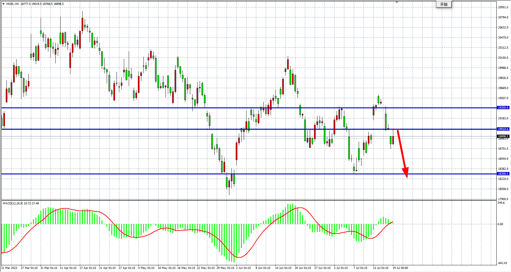 4小时图看,恒指在19000关口下走跌,MACD量能在零轴上缩量,目前主要关注19000关口阻力,该位之下看跌18500-18300。