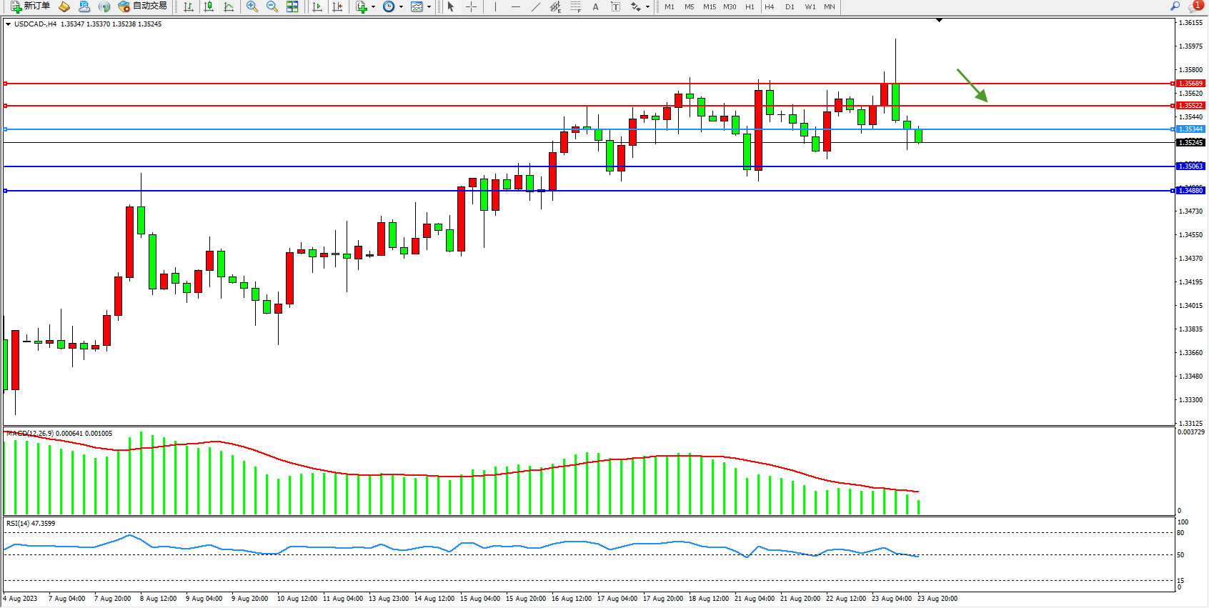 美元加元USDCAD——4小时K线图显示: