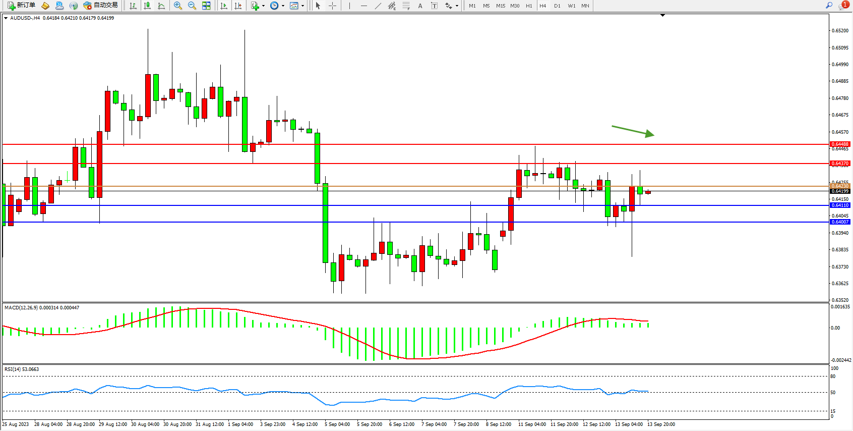 备选策略:0.64230上方看涨,目标0.64370 0.64488
