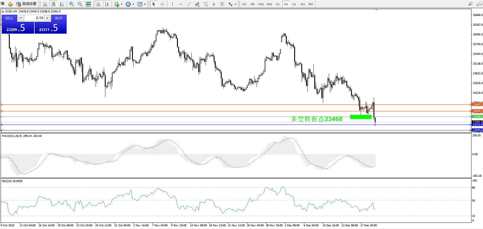 道琼斯指数DJ30—— 4小时K线图显示: