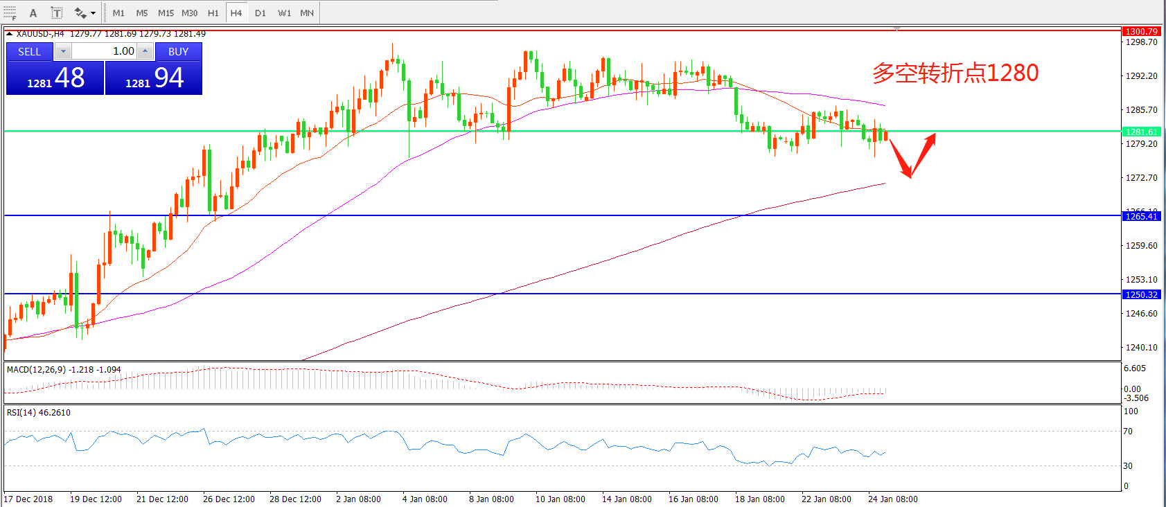 交易策略: 1280.00之下看跌,目标1265.00 1250.00