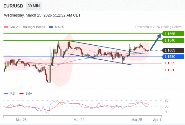 在 1.1580 之上,看涨,目标价位为 1.1640 ,然后为 1.1665 。