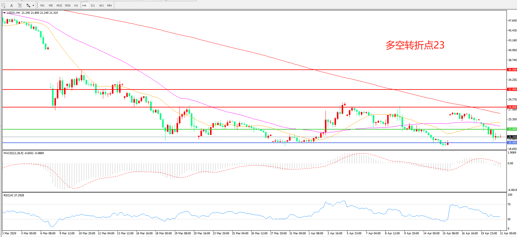 交易策略:在23.00之下看跌,目标20.00         18.00