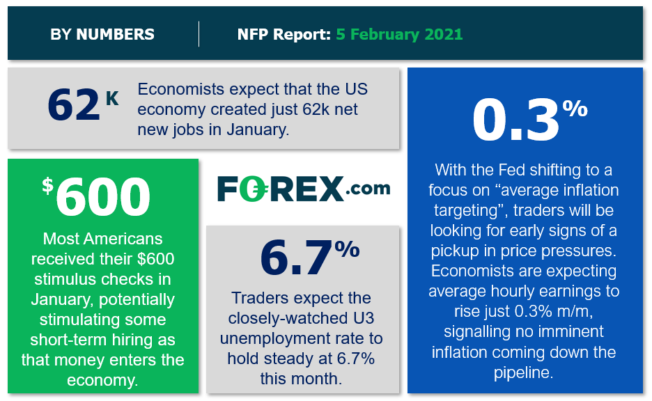 大部分美国人在1月份收到了亟需的援助支票(人们对新一轮财政刺激政策即将出炉的信心日渐增强)、疫苗继续快速投放、美国政府也终于平稳换届。未来的日子毫无疑问依然黑暗,但交易员相信劳动力市场将改善,预测新增就业近6万人、薪资月率上涨0.3%。