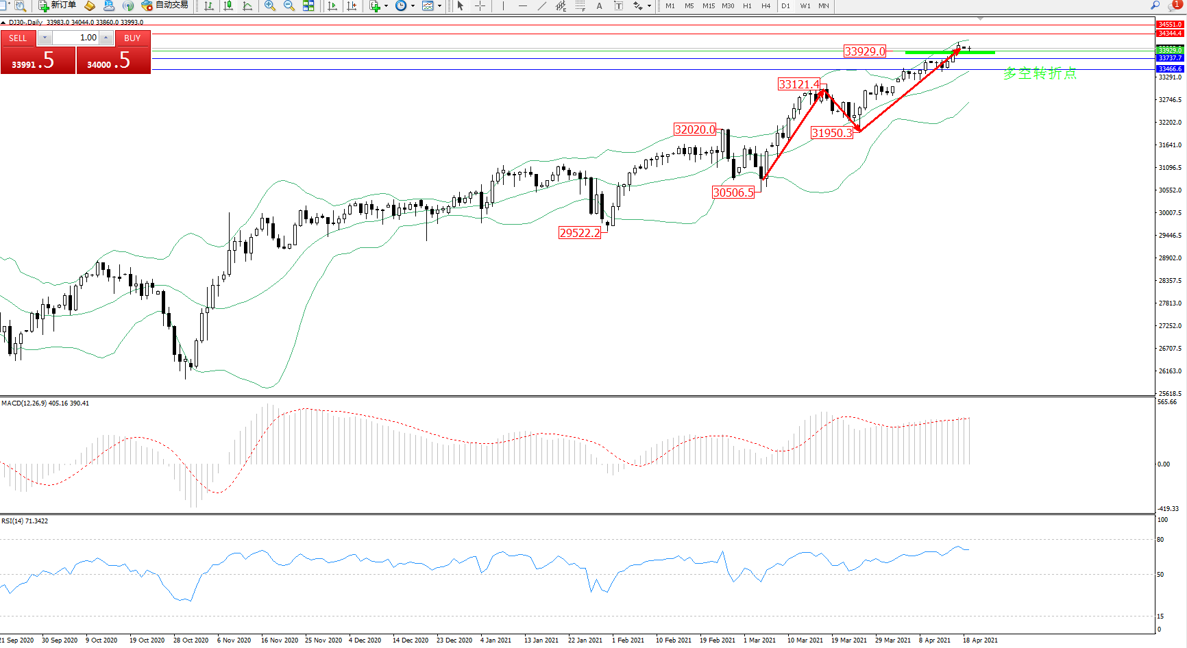 交易策略:33929上方看涨,目标34344、34551
