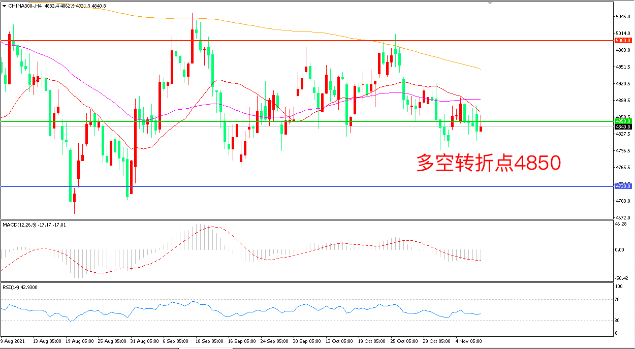 4小时图看,沪深300受制于均线压制,疲弱走势明显,55周期均线成为上方阻力,4850成为多空分水岭,MACD绿柱增加,RSI指标走平,日内震荡下行概率较大。