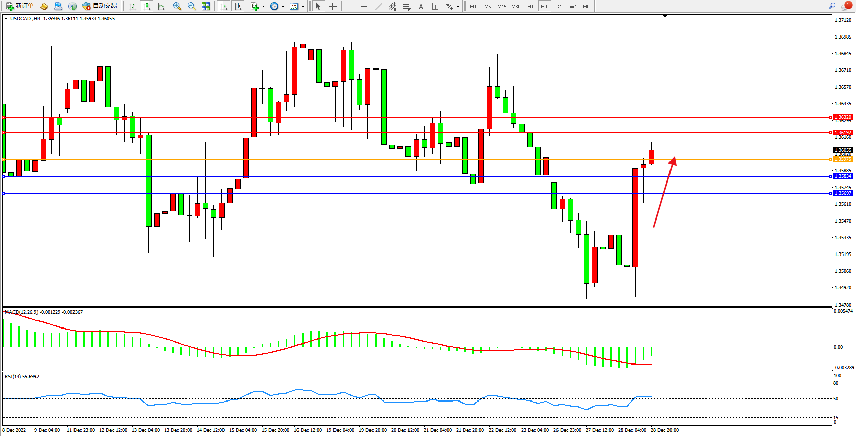 美元加元USDCAD——4小时K线图显示: